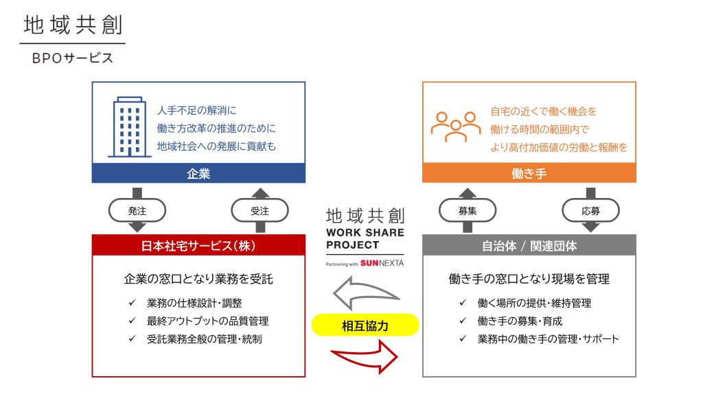 『地域共創BPOサービス』では、日本社宅サービスが窓口となって企業から業務を受託し、その業務を地域のワーカーに再委託します。